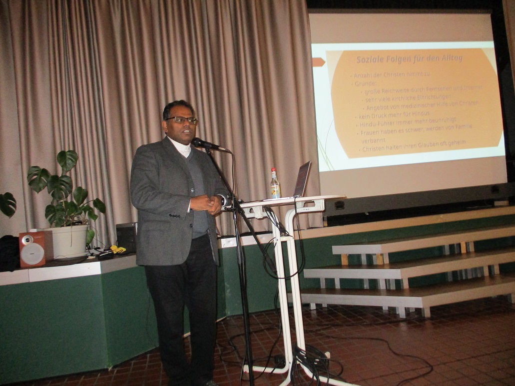 Ca. 30 Millionen Christen leben überwiegend im Süden und im Nordosten Indiens. Sie bilden ca. 2,5 % der Bevölkerung. Die Missionierung begann dort durch den Apostel Thomas im Jahr 52/53 nach Christus. Zum weiteren Leben erweckt wurde das Christentum im 16. Jahrhundert durch Franz Xaver. Das Christentum in der Heimat Pater John-Peters im Süden Indiens wurde aber maßgeblich durch Pater und Märtyrer Johannes de Britto, einen portugiesischen Jesuiten geprägt. Dessen Botschaft war es, sich mit den nicht zu ändernden Gegebenheiten zwar zu arrangieren, aber gleichzeitig sich den Notleidenden und Verachteten der Bevölkerung anzunehmen. Das fest verankerte Kastenwesen und die hinduistische Denkweise machen es auch heute sehr schwer, christliches Gedankengut weiterzugeben. Fanatische Hindus übten zudem Druck auf die Christen aus, besonders in Zentralindien. Dabei garantiert die Verfassung Indiens Religionsfreiheit und freie Ausübung der Religion. Trotz der Repressalien nehme der Anteil der Christen Indiens zu, wobei viele ihren Glauben aber wegen des Druckes nicht öffentlich bekennen. Kennzeichnend für das Christentum in Indien sei das soziale Engagement, Bildung und Weiterbildung auch für Verstoßene der Gesellschaft, vor allem Mädchen und Frauen sowie Angebote im Gesundheitsbereich. Unterstützt werden sie dabei von christlichen Hilfswerken. Ein Projekt im Heimatort Pater John-Peters wird auch durch die Pfarrgemeinde St. Nikolaus und die Kolpingsfamilie Jügesheim gefördert.Bericht + Bild: Norbert Löw
