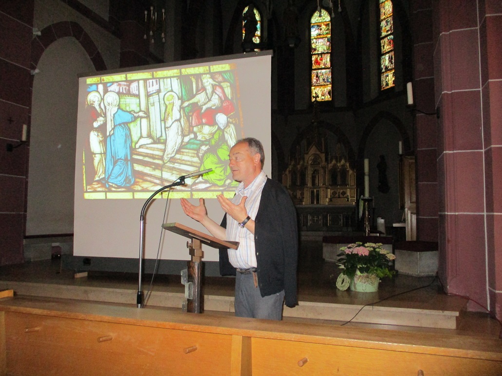 "Die Fenster im Chor von St. Nikolaus" waren Thema einer Präsentation von Pfarrer Hermann Differenz bei den Jügesheimer Kolpingern. Es handelt sich hier um drei Fensterreihen, mit je 5 Bildern, im oberen Teil der Ostseite der Jügesheimer Pfarrkirche. Der Bilderbogen spannt sich mit alttestamentarischen Themen von der "Erweckung des Jünglings von Nain" bis zu den " Israeliten in der Wüste", wo Moses mit dem Stab gegen den Felsen schlägt. Humorvoll und mit kleinen Anekdoten gespickt, erklärte Pfarrer Differenz, dessen Elternhaus schräg gegenüber der Kirche stand, die biblischen Darstellungen. Zum Ende des Vortrages war das Gewitter um Jügesheim abgezogen und es blieb noch genügende Zeit, sich mit dem Pfarrer und Giesemer Bub auszutauschen. Bericht + Bild: Herbert Massoth