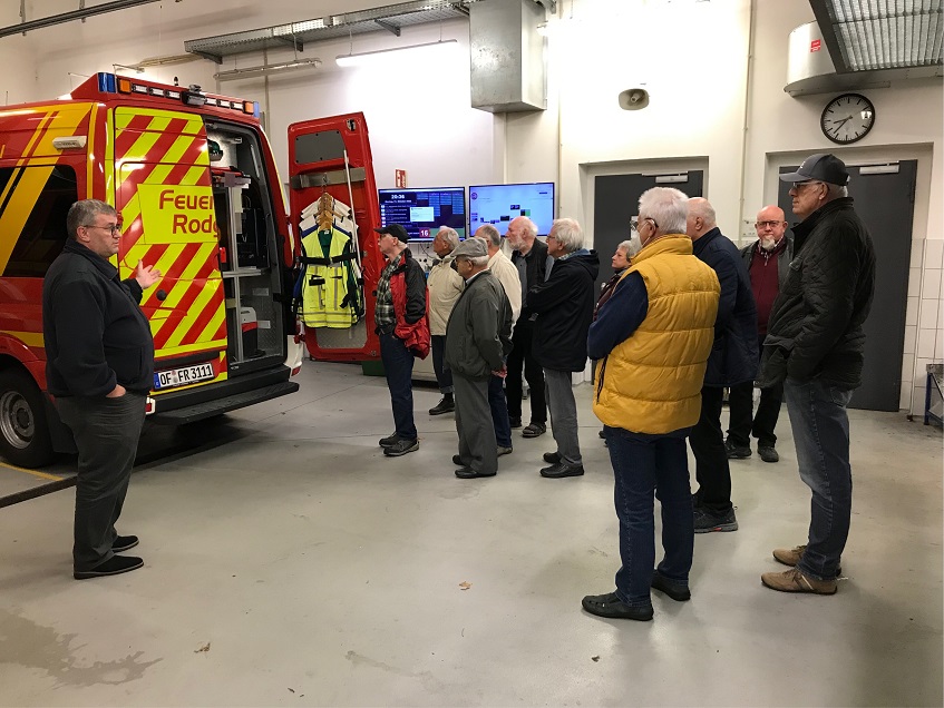 Am Montag, den 31. Oktober besuchte die Kolpingsfamilie Jügesheim die Feuerwache Rodgau Mitte. Der Leiter der Stabsstelle Feuerwehr, Andreas Winter, führte die interessierte Gruppe. Der Rundgang begann im Eingangsbereich mit einer kurzen Orientierung zum Aufbau des Gebäudes und dem Hinweis, dass der Fahrstuhl darauf ausgelegt ist, auch Europaletten zu befördern. Die Kolpinger erfuhren, das 9,5 Menschen bei der Stadt als Feuerwehrleute beschäftigt sind und von Montag bis Freitag im Gebäude u.a. Instandsetzungs- und Ausbesserungsarbeiten durchführen. Nach 25 Jahren werden neue Einsatzwagen bestellt, ab dann können Zuschüsse beantragt werden. Bis zur Bewilligung dauert es ca. 1 Jahr, dann folgt eine europaweite Ausschreibung. Nach ca. 28 Jahren kann dann das alte gegen das neue Fahrzeug ausgetauscht werden. Bei kleineren Wagen, z.B. einem Sprinter, kann dies schon nach ca. 12 Jahren erfolgen. Der Weg führte nun in die Florianstube, dem Aufenthaltsraum der Feuerwehrleute. Als nächstes wurde die Einsatzzentrale besichtigt. Sie ist mit ein bis zwei Personen während eines Einsatzes besetzt. Weiter ging es zur Fahrzeughalle. Hier stellte uns Herr Winter die verschiedenen Fahrzeuge und deren Ausrüstung vor. Zunächst zeigte er den Wagen der Einsatzleitung. Hier erfolgt auch während des Einsatzes bereits ein Teil der Dokumentation.
