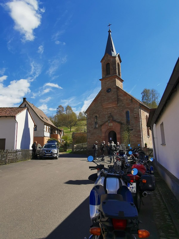 Karfreitagstour der Motorradfahrer mit Besuch der Karfreitagsliturgie, 15. April 2022 Seit 1999 unternehmen Motorradfahrer der Kolpingsfamilie Jügesheim an Karfreitag eine Tour in umliegende Mittelgebirge und besuchen eine Karfreitagsliturgie, seit einigen Jahren bevorzugt in einer Gemeinde mit einem aus der Pfarrgemeinde Jügesheim oder Dudenhofen stammenden Priester. Einmal fiel die Tour witterungsbedingt, zweimal coronabedingt aus. Corona hat noch immer zahlreiche Veranstaltungen im Griff. So finden weder die traditionell besuchte Karfreitagsprozession in Lohr noch das Anlassen im Vogelsbergdorf Bindsachsen statt. Dennoch haben sich bei strahlender Sonne aus klarem Himmel aber noch morgendlicher Kühle sieben Teilnehmer und eine Teilnehmerin auf sieben Motorrädern an der Kirche St. Marien in Dudenhofen eingefunden. Zunächst geht es durch den Odenwald über Waldamorbach nach Obernburg und dann durch den Spessart über Altenbuch zur Geißhöhe. Nach dem Mittagessen wird in weiten Schleifen auf wenig befahrenen Strecken durch den Spessart gefahren, so dass rechtzeitig Jakobsthal zur Karfreitagsliturgie erreicht wird. Diese wird mit dem aus Jügesheim stammenden Pfarrer i.R. Edgar Sahm zusammen gefeiert, wobei die Motorradfahrer etwa 50% der Gottesdienstbesucher ausmachen. Pfarrer Sahm findet danach auch noch trotz Termindruck Zeit zu einem Kaffeeplausch. Danach geht es kurvig durch den Spessart und mit geringst möglichem Autobahnanteil zurück nach Rodgau. Bericht + Bild: Michael Jung