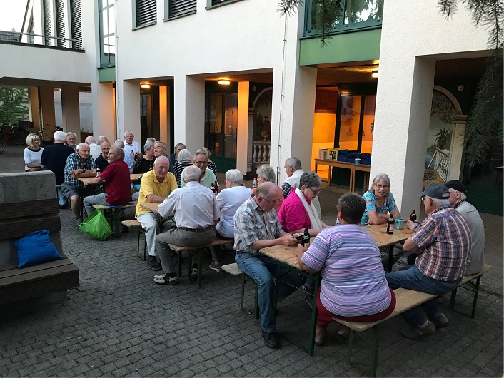 An Kerbmontag ludt die Kolpingsfamilie hinter dem Haus der Begegnung zum Kerbschoppen ein. Rund 30 Gäste verbrachten einen schönen Sommerabend bei Leberkäsbrötchen und kühlen Getränken. Erinnerungen kamen auf an die traditionellen Kerbschoppen bei Hähnchen und Hackbraten in der leider nicht mehr existenten Kultgaststätte „Bei Ammie“. Bericht + Bild: Jens Werner