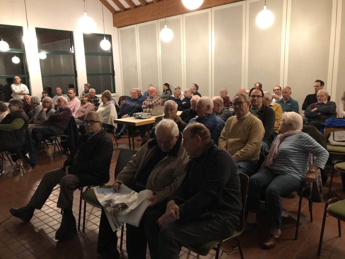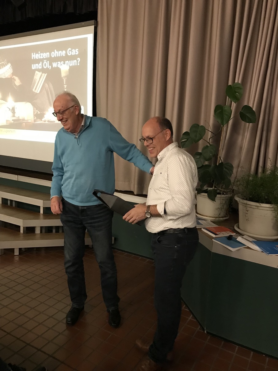 Am Montag, den 20. November referierte Dipl. Ing. (FH) Sven Loferer zum Thema „Heizen ohne Öl und Gas – was nun?“. Das hochaktuelle Thema fand reges Interesse. Vor rund 80 Gästen berichtete Bauingenieur und Energieberater Sven Loferer über die derzeitige Gesetzeslage und mögliche Lösungen rund ums Heizen. Über den Klimawandel in Verbindung mit fossilen Brennstoffen, Heizverluste an Wohngebäuden, alternative Brennstoffe, Verbräuche über das Jahr, verschiedene Energieträger, praktikablen Lösungen bis hin zu einer Vision für die Zukunft führte die kurzweilige Präsentation, während dieser Fragen aus dem Auditorium von Herrn Loferer kompetent beantwortet wurden.Im Anschluss überreichte der Vorsitzende der Kolpingsfamilie Jügesheim, Herbert Massoth, in guter Tradition eine Flasche Wein an den Referenten.