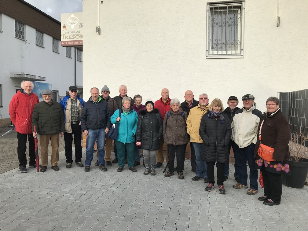 Am 27.12 gingen 17 Schwestern und Brüder der Kolpingsfamilie Jügesheim auf ihre alljährliche Winterwanderung. Ziel war dieses Jahr das Lokal "Tresor" in Weiskirchen. Vom HdB starteten die Kolpinger gegen 10 Uhr. Es ging über die Hochstädter Straße auf die andere Seite der B45. Entlang des Feldwegs, neben der B45, ging es nach Weiskirchen. An der Schönstadt Kapelle wurden gebetet und dann ging es über die Brücke zum Lokal "Tresor". Dort kamen noch Wanderer dazu, die mit dem "Auto" dorthin gewandert waren. Bei leckerem Essen und interessanten Gesprächen endete die letzte 2023er Veranstaltung. Am Ende wurde noch die weihnachtliche Tischdekoration verzehrt. Netterweise brachte die Bedienung noch weitere leckere Tischdeko zum essen. Um ca. 14:30 Uhr ging es dann wieder nach Hause. Autor: Gerald DavidBild: Jens Werner