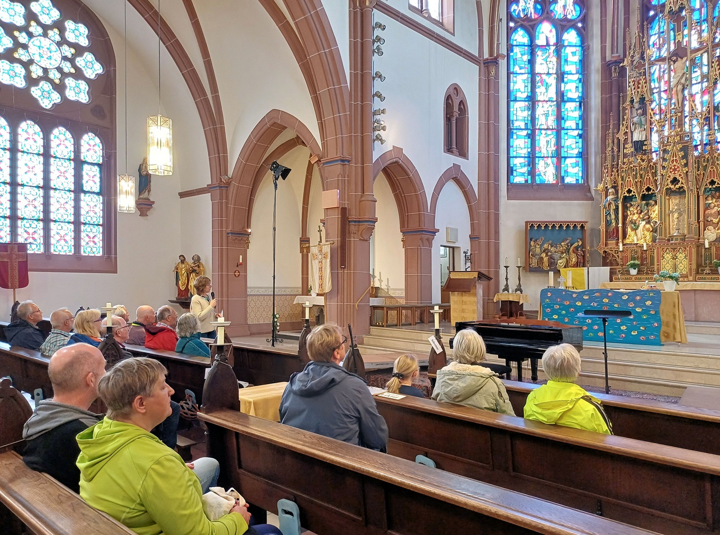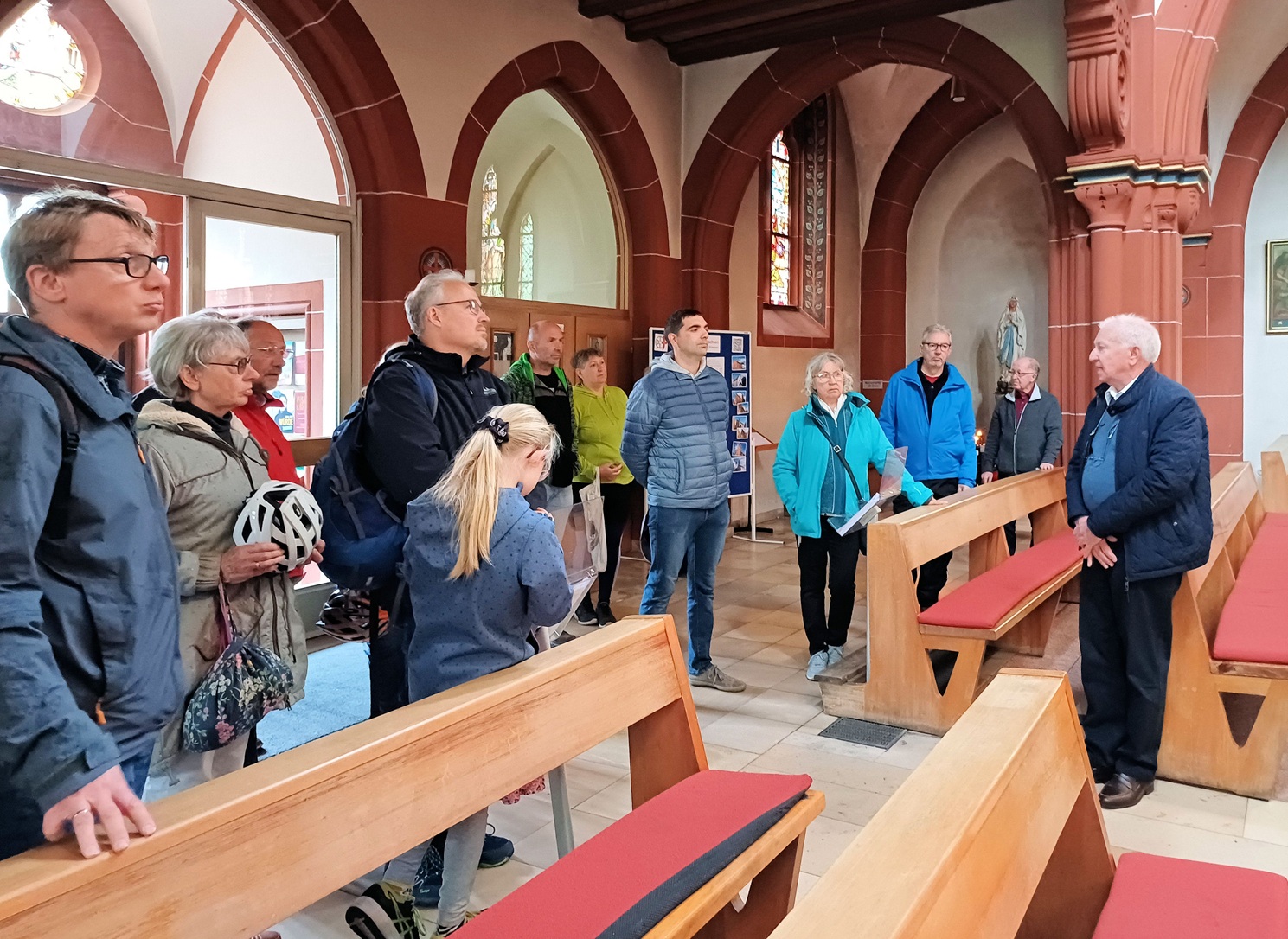 Über 20 Teilnehmerinnen und Teilnehmer startete bei St. Nikolaus in Jügesheim. Die Führung durch die 1871 fertiggestellte Kirche und Pfarrgarten wurde von den Jügesheimer Messdienern Julius Roßkopf und Philip Ginzkey bestens organisiert. Geschichtliche Daten, Begebenheiten, sowie einen kleinen Film zur Pfarrei präsentierten die sehr gut vorbereiteten Messdiener. Weiter ging die Radtour nach Nieder-Roden. Ein kleiner Schauer begrüßte die Gruppe am Ortseingang. Bernard Koser, ein waschechter Nirreräirer , Kenner von Orts- und Kirchengeschichte und Organist in St. Matthias, führte die Gruppe durch die 1896 in der heutigen Ausprägung fertiggestellte Kirche. Die erste urkundliche Erwähnung einer Kirche in Nieder-Roden stammt aus dem Jahr 1298. Der restaurierte und erhaltene Wehrturm aus dem 16. Jahrhundert gilt als das älteste erhaltene Gebäude in Rodgau. Der nächste Halt war am jüngsten Rodgauer Gotteshaus in Rollwald. Die kleine moderne, helle 2014 erbaute Kirche, bietet einen reizvollen Kontrast zu den neugotischen Kirchenbauten rundum. Auch hier führte Bernhard Koser die Gruppe. Er informierte über die Geschichte von Rollwald und der Kirche. Ohne den engen Zeitplan hätte man noch lange verweilen und Geschichte und Geschichten von Bernhard Koser hören wollen. Abschließend ging die Fahrt nach St. Nazarius in Ober-Roden. Die Kolpingschwester -Astrid Hitzel – gestaltete kenntnisreich und engagiert die Führung. Das neugotische Gotteshaus wurde 1896 fertiggestellt. Forschungen lassen vermuten, dass hier bereits im 8. Jahrhundert das Benediktinerinnenkloster Rotaha stand. In der Martinsstube wurden die Gäste anschließend mit belegten Broten und Getränken verwöhnt. Die rundum gelungene Veranstaltung klang am frühen Abend aus. Ein „Dankeschön“ an alle Mitwirkenden, Organisatoren und an alle helfenden Hände.