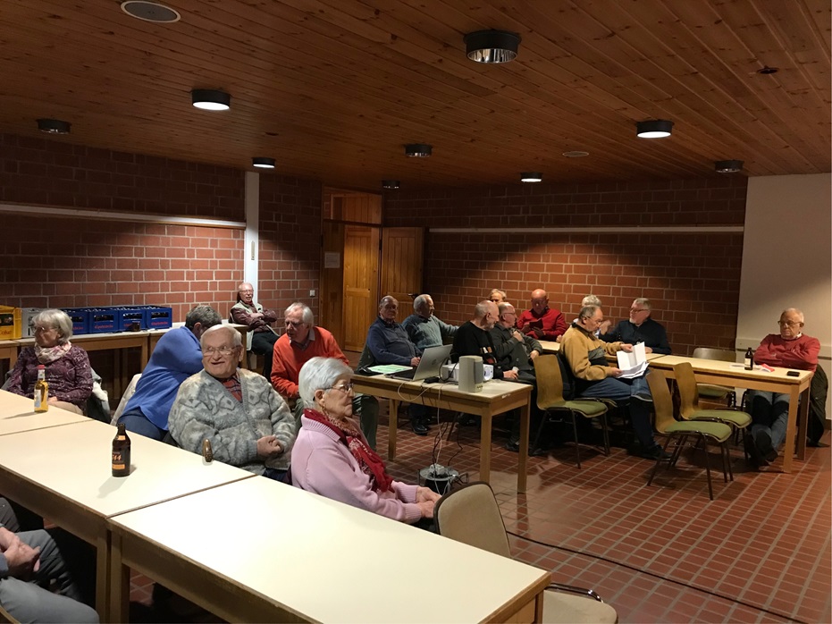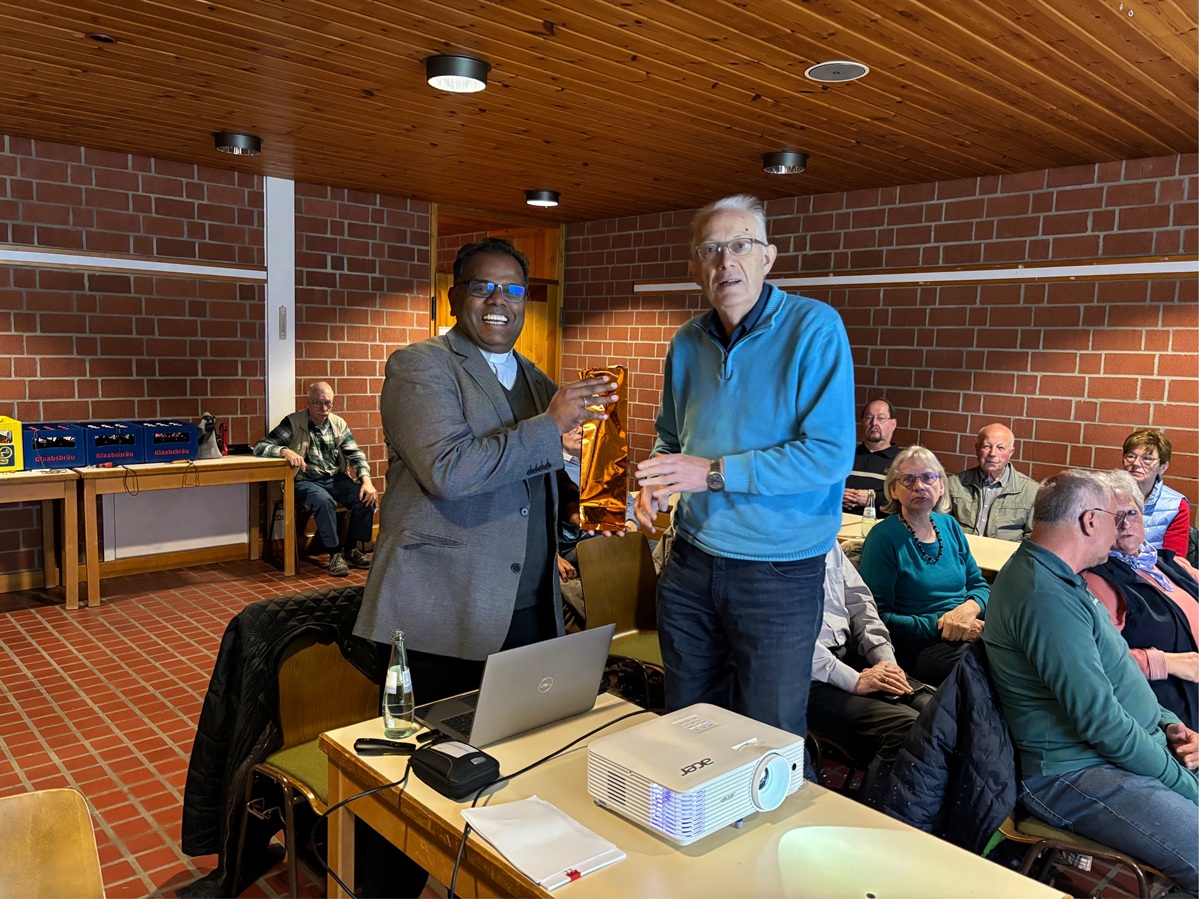 Rückblick auf Aktionen und Veranstaltungen des Jahres 2024 Am 20. Januar präsentierte Alois Sahm im Jügesheimer Haus der Begegnung vor rund 25 Gästen einen Rückblick auf die Aktionen und Veranstaltungen des Jahres 2024. Die Bilder wurden vom Referenten kommentiert, viele Gäste trugen humoristische Anekdoten und Kommentare zu den Aktionen bei. Michael Jung berichtete ausführlich von der Pilgerwanderung und den Motorrad-Touren, Karl-Heinz Demuth von den Wanderungen und Annette Massoth von der Hüttenfahrt der Frauen. Im Anschluss bedankte sich der 1. Vorsitzende Herbert Massoth bei Alois Sahm für die gelungene Präsentation mit einem kleinen Präsent.